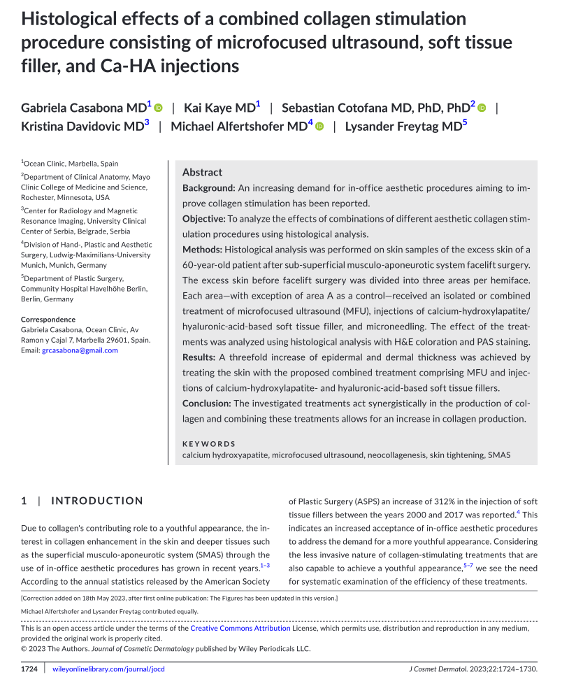 Citation: Histological effects of a combined collagen stimulation procedure consisting of microfocused ultrasound, soft tissue filler, and Ca-HA injections. J Cosmet Dermatol. 2023 Jun;22(6):1724-1730. doi: 10.1111/jocd.15770. Epub 2023 Apr 18. PMID: 37073423.